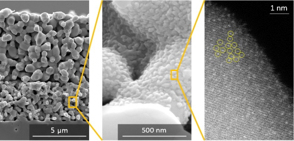 ▲ (왼쪽)고체산화물 연료전지 전극, (가운데)전극 내부의 표면에 형성되어 있는 단일원자 촉매, (오른쪽)촉매 표면에 분산되어 있는 백금 원자(밝은 점: 백금 원자)나노입자를 결합해 백금 원자 개별 반응성을 크게 향상시킨 고성능 ‘원자촉매’가 개발 돼 전력과 수소를 동시에 생산 가능하게 될 것으로 기대를 모으고 있다.