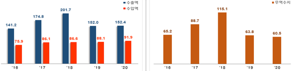 EU 수출은 전년동월대비 1.8% 감소한 8.6억달러를 기록했고, 일본 수출은 16.6% 감소한 2.7억달러를 기록했다.