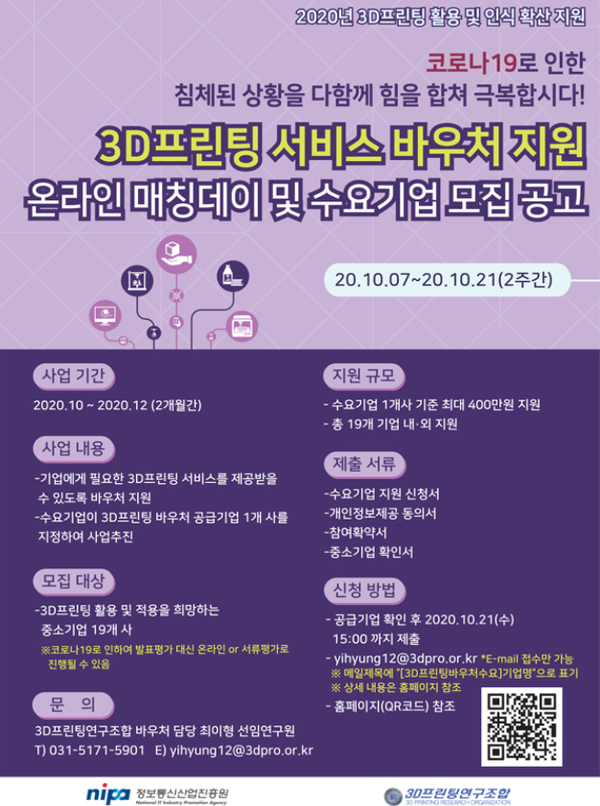 접수는 오는 10월21일 15시까지며 관련 서류를 홈페이지(https://voucher2020.imweb.me)에서 내려받아 이메일(yihyung12@3dpro.or.kr)로 접수하면 된다. 기타 자세한 사항은 홈페이지 또는 전화(031-5171-5901)로 문의하면 된다.