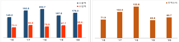 지역별 수출은 중국(81.7억달러, 5.6%↑), 베트남(31.1억달러, 18%↑), 미국(20.4억달러, 36.3%↑) 유럽연합(10.7억달러, 15.9%↑) 등은 증가했고, 일본(3.4억달러, 9.0%↓)은 감소했다.