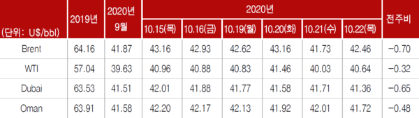 한국석유공사 석유동향팀은 23일 ‘유가정보서비스 오피넷’을 통해 ‘2020년 10월 3주 주간 국제유가동향’을 발표했다.