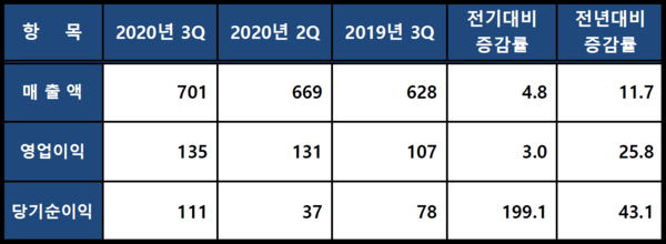 ▲ 원익머트리얼즈 2020년 3분기 경영실적(단위 : 억원,%)원익머트리얼즈가 2020년 3분기 반도체, 디스플레이 고객사 가동율 증가로 역대 최대의 실적을 거뒀다.