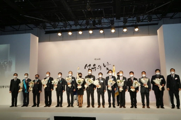 ▲ 섬유의 날 수상자들이 기념촬영을 하고 있다.크린앤사이언스(대표 곽규범)가 국내 마스크 수급 안정에 기여하며, 코로나19 대응에 일조한 공로를 인정받았다.