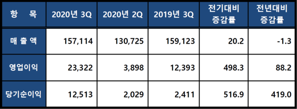 한전은 12일 2020년 3분기 경영실적을 발표했다. 이에 따르면 매출은 연결재무제표기준으로 15조7,114억원을 기록해 전년동기대비 1.3% 증가했고, 영업이익은 2조3,322억원으로 전년동기대비 88.2% 증가했다. 당기순이익은 1조2,513억원으로 전년동기대비 419% 상승했다.