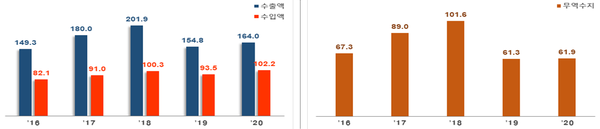 산업통상자원부가 16일 발표한 10월 ICT 수출입동향에 따르면 수출은 전년동월대비 6% 증가한 164억달러, 수입은 9.2% 늘어난 102억2천만달러로 무역수지는 61억8천만달러 흑자를 기록했다.