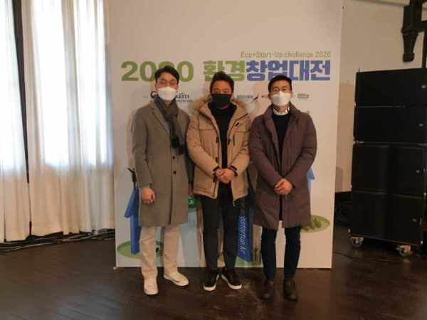▲ 환경창업대전에서 우수상을 수상한 황정호 클로이 대표(左)와 수상자들이 기념촬영에 응하고 있다.공장, 축산 등 폐수에서 인(P)을 회수해 비료로 활용할 수 있는 기술을 보유한 클로이(대표 황정호)가 환경산업에서 사업화 가능성이 우수한 아이디어로 인정받았다.