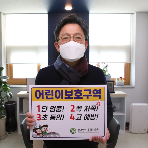 ▲ 방윤혁 탄소융합기술원 원장이 어린이 교통안전 챌린지 캠페인에 동참하고 있다.방윤혁 한국탄소융합기술원장이 어린이들의 안전한 교통문화를 정착시켜 나가기 위한 분위기 확산에 동참했다.
