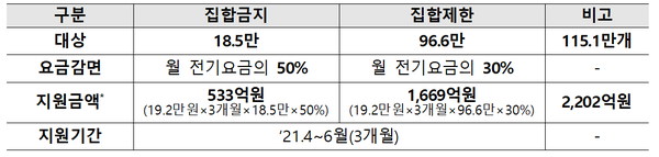 이번 전기료 감면 대상은 집합금지 업종 18.5만호, 집합제한 업종 96.6만호이며, 3개월분(4~6월) 전기요금을 지원(집합금지 50%, 제한 30%)할 계획이다. 지원 기준 금액은 대구·경북 소상공인 월평균 전기요금인 19만2천원으로 국회 심의를 거쳐 추경안이 확정되면 시행될 예정이다.