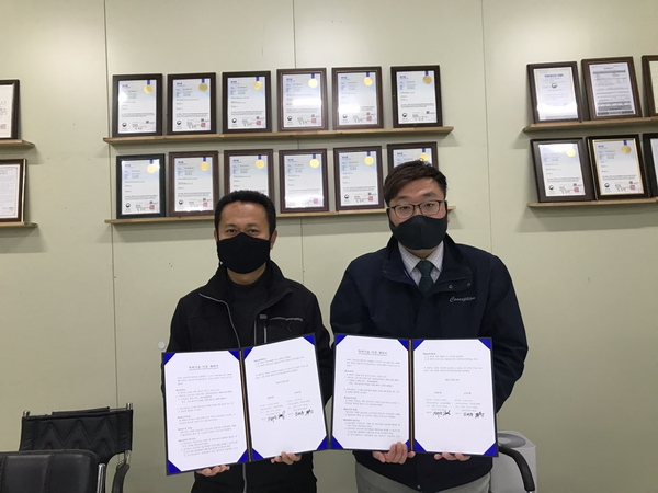 ▲ 정구상 컨셉션 대표(右)와 김태훈 노바소프트 대표가 기술이전 계약 체결 후 기념촬영에 응하고 있다.