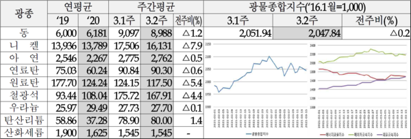 한국광물자원공사 자원정보팀은 15일 3월 2주차 주요 광물가격 동향을 발표했다. 이에 따르면 3월 2주 광물종합지수는 2,047.84로 전주대비 0.2% 하락했다.