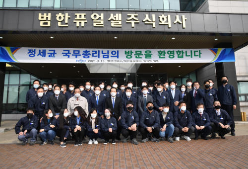 정세균 국무총리는 15일 우리나라 수소경제를 선도하고 있는 경남 창원시에 소재한 수소 강소기업인 범한산업·범한퓨얼셀을 방문했다.