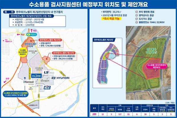▲ 수소용품 검사지원센터 예정부지 위치도 및 제안개요전라북도와 완주군이 국내 수소산업의 핵심기관인 ‘수소용품 검사지원센터’ 유치에 성공하면서 대한민국 수소산업을 이끌 선봉장으로서의 입지를 탄탄히 굳혔다.