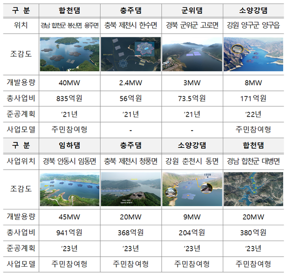 이에 올해 내로 합천댐(40MW), 충주댐(2.4MW), 군위댐(3MW) 등 3개 댐에서 총 45.4MW 규모의 수상태양광 사업이 조기에 준공된다. 2022년까지 소양강댐(8MW) 사업이 준공되고, 2023년에는 임하댐(45MW), 충주댐(20MW), 소양강댐(9MW), 합천댐(20MW)에서 총 94MW 규모의 사업이 준공된다.