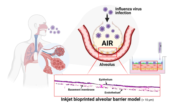 정성준 교수는 “바이오 프린팅을 이용해 세포를 프린팅하고, 조직을 제작하고 있지만, 약 10 μm 두께의 3층 구조를 가진 폐포의 장벽을 모사한 것은 세계 최초”라며 “인공 폐포를 바이러스에 감염시켜 생리학적 항바이러스 반응을 관찰한 사례 역시 처음”이라고 밝혔다.