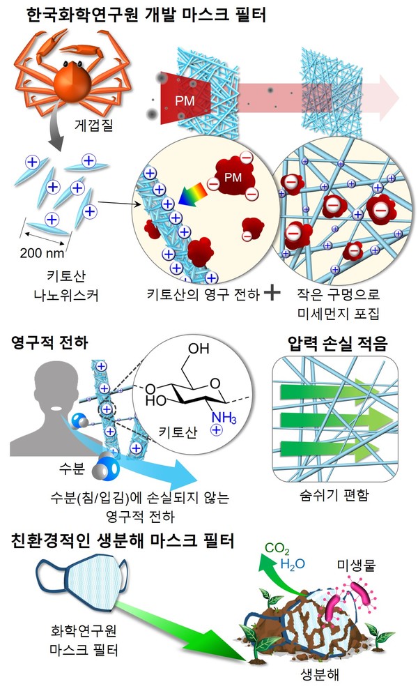 한국화학연구원은 황성연·오동엽·박제영 박사 연구팀은 대표적 생분해 플라스틱인 폴리부틸렌 숙시네이트(PBS)를 가느다란 나노 섬유와 마이크로 섬유 형태로 뽑은 후 섬유들을 겹쳐 부직포를 만들었다. 이 부직포를 자연에서 추출한 키토산 나노위스커로 코팅해 최종 필터를 완성했다.