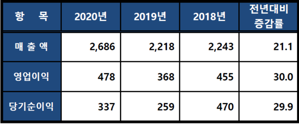 원익머트리얼즈는 지난 16일 사업보고서를 공시했다. 이에 따르면 2020년 단독 재무제표 기준 매출은 2,686억원으로 전년대비 21.1% 증가했고, 영업이익은 478억원으로 전년대비 30.0% 증가했다. 당기순이익은 337억원으로 전년대비 29.9% 증가했다.