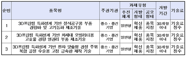 한국산업기술평가관리원(KEIT)은 2021년도 전자시스템산업기술개발사업 신규지원 대상 과제 중 ‘3D프린팅 특화설계(DfAM) 기반 스마트제조기술개발’ 과제로 △3D프린팅 특화설계 기반 절삭공구용 부품 경량화 및 고기능화 제조기술 △3D프린팅 특화설계 기반 차세대 모빌리티용 고효율 경량 열관리 부품 제조기술 △3D프린팅 특화설계 기반 환자 맞춤형 관절 주위 복합 골절 수술용 고정 금속판 제조 기술 등을 31일 공고했다. 당초 RFP 후보에 올랐던 건축과 반도체 부품 관련 과제는 이번에 선정되지 않았다.