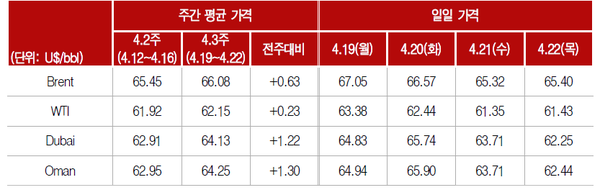한국석유공사 석유정보센터(PISC)가 발표한 ‘4월 3주 주간 국제유가동향’에 따르면 대서양 유종인 브렌트(Brent)유의 평균가격은 전주대비 배럴당 0.63달러 상승한 66.08달러를 기록했고, 미국 서부텍사스산원유(WTI)는 전주대비 0.23달러 상승한 62.15달러를 기록했다.
