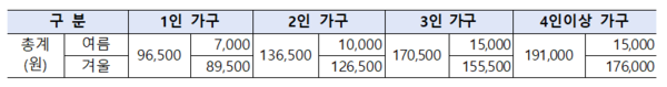 지원금액은 △1인 가구 96,500원(여름 7,000원, 겨울 89,500원) △2인 가구 136,500원(여름 10,000원, 겨울 126,500원) △3인 가구 170,500원(여름 15,000원, 겨울 155,500원) △4인이상 가구 191,000원(여름 15,000원, 겨울 176,000원)이다.