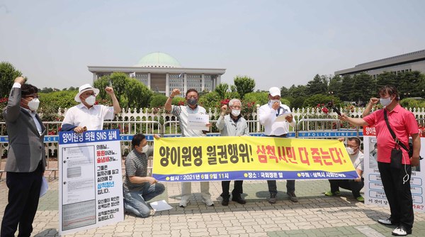 ▲ 국회 앞에서 양이원영국회의원의 공개사과와 사퇴를 촉구하는 기자회견을 하는 삼척시민삼척사회단체가 8개월째 이어지고 있는 삼척화력발전소 항만공사 중단과 관련, 서울로 상경해 공사 재개를 촉구했다.
