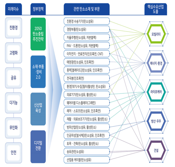일본의 수출 규제, 코로나19 등에 따라 제조업 핵심 소부장 제품의 국내 생산기반과 공급망 확보의 중요성이 부각 됐다. 소재·부품·장비는 기술 속의 기술로서 제조업 발전의 필수요소다. 특히 소재는 범용성을 바탕으로 회복력 강한 산업생태계 조성에 핵심적인 역할을 담당하는 산업의 허리에 해당한다. 그중 탄소소재는 범용소재를 대체할 수 있기 때문에 대외 의존도가 높은 전략 핵심 품목의 생산기반을 구축하고 타 소재·부품과의 융복합을 통해 성능 강화 및 신 부가가치를 창출해야 한다.