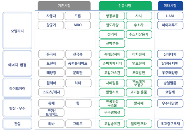 ▲ 수요산업별 시장 유형(자료:산업부 탄소산업 기술개발 로드맵)모빌리티·에너지 등 5대 산업 개발 추진