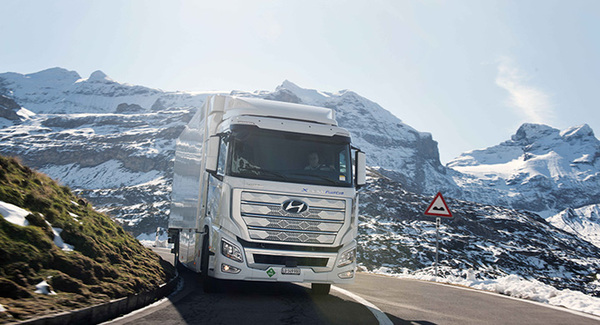 ▲ 스위스에 수출돼 운행중인 현대자동차의 엑시언트 수소전기트럭현대자동차가 세계 최초 양산한 대형 수소전기트럭 엑시언트가 지난해 7월부터 현재까지 스위스에서 종합 누적거리 100만 km를 돌파했다.