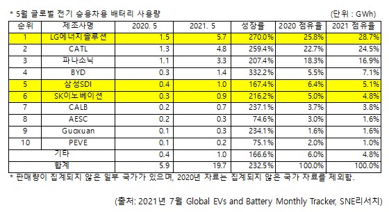 SNE리서치가 발표한 5월 글로벌 전기차에 탑재된 배터리 사용량 순위에 따르면 LG에너지솔루션의 배터리 사용량은 5.7GWh(점유율 28.7%)로 CATL 4.8GWh(점유율 24.5%)을 넘어섰다. 월별 배터리사용량 순위에서 1위에 오른 것은 올해 처음이다.