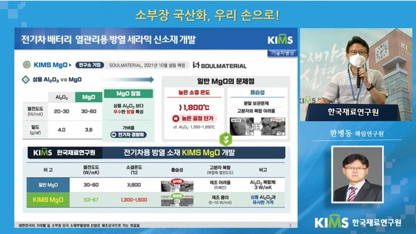 재료연 한병동 책임연구원은 17일 유튜브를 통해 진행된 온라인 소재부품장비 기술자립을 위한 재료연 연구성과 발표에서 ‘전기차 배터리 열관리용 방열 세라믹 신소재’에 대해 발표했다.