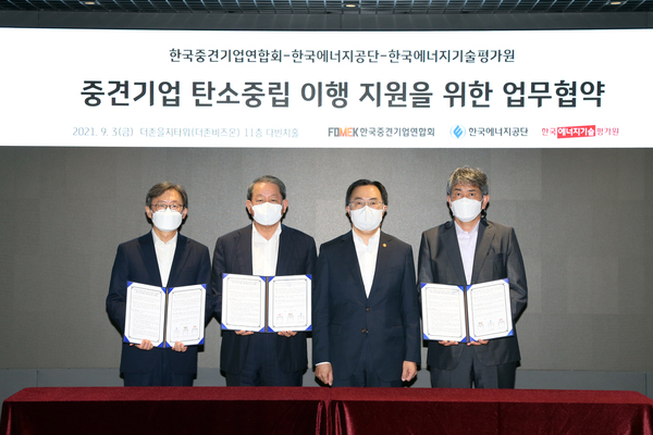 산업부, 에공단·에기평 및 중견련은 탄소중립 이행에 있어 중견기업의 적극적인 역할이 필요함을 인식하고, 이를 지원하기 위해 중견련-에너지 공공기관간 ‘중견기업 탄소중립 지원협력 MOU’를 체결했다.