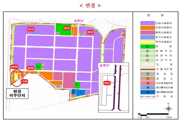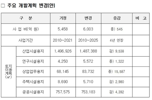 주요 변경내용을 살펴보면 △사업기간을 2010년부터 2021년에서 2010년부터 2025년까지로 변경했다. △사업비는 5458억에서 6003억으로, △유치업종은 11개업종에서 8개 업종으로 변경됐다. △토지이용계획에서는 연구시설용지 반영, 이주단지(17세대)위치변경, 내부간선도로 확장 등이 있다.