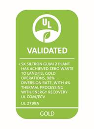 폐기물 매립 제로 인증은 미국 최초 안전인증기업 UL이 매년 사업장에서 발생하는 총 폐기물 중 재활용 불가능 폐기물 제외 후, 재활용률을 수치화해 우수한 사업장에 △Platinum(재활용률 100%), △Gold(95~99%), △Silver(90~94%) 3단계의 등급을 부여하는 제도다.