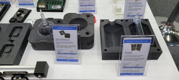 에센티움이 선보인 ‘PA-CF’ 필라멘트는 나일론에 탄소섬유를 첨가한 것으로 내구성이 향상돼 100개 이상의 부품을 사출할 수 있는 금형을 제작할 수 있다. 또한 무게도 가벼운데다 제작시간도 기존 FDM 3D프린터 대비 4.3배 이상 빠른 것이 특징이다. 이밖에도 회사는 블로우 금형을 제작할 수 있는 ‘HTN-CF25’ 필라멘트도 선보여 참관객들로부터 주목을 받았다.