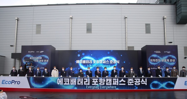 에코프로는 에코프로이엠(대표이사 박종환)이 21일, 경북 포항시 영일만 산단 내 에코배터리 포항캠퍼스에서 에코프로이엠 CAM6 공장 준공식을 갖고 생산을 위한 시운전에 들어갔다고 21일 밝혔다. 이날 준공식에는 이철우 경북도지사와 이강덕 포항시장, 전영현 삼성SDI 대표이사, 이동채 에코프로 회장 등 지역 유관 기관 및 주요 고객사 관계자 등 200여 명이 참석했다.