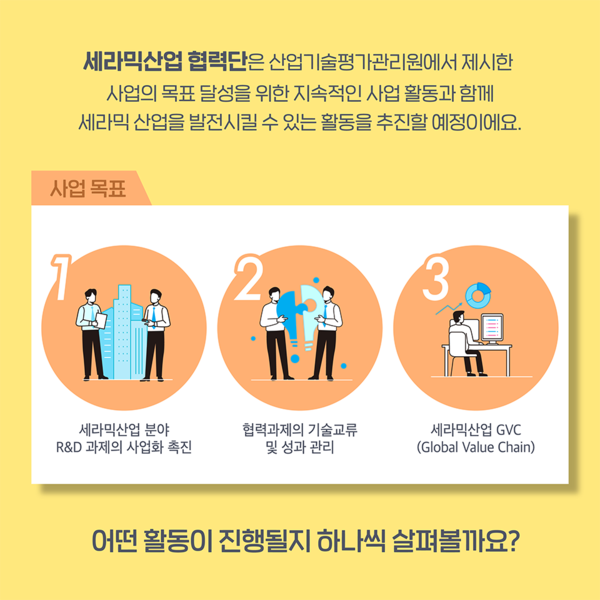 세라믹산업 협력단은 산업기술평가관리원에서 제세한 사업의 목표 달성을 위한 지속적인 사업 활동과 함께 세라믹 산업을 발전시킬 수 있는 활동을 추진할 예정이에요.