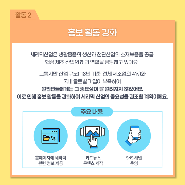 세라믹 산업은 생활용품의 생산과 첨단산업의 소재부품을 공급, 핵심 제조 산업의 허리 역할을 담당하고 있어요. 그렇지만 산업규모(18년 기준, 전체 제조업 4%)와 국내 글로벌 기업이 부족하여 일반인들에게는 그 중요성이 잘 알려지지 않았어요. 이로 인해 홍보활동을 강화하여 세라믹 산업의 중요성을 강조할 계획이에요.