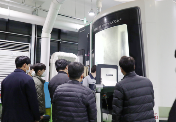 ▲ 서부발전 관계자들이 엠쓰리파트너스에 구축된 금속 3D프린터를 보고 있다.