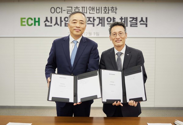 ▲ 금호피앤비화학 신우성 대표(좌) OCI 김택중 대표(우)기초화학제품과 태양광 등 신재생에너지 사업의 대표기업인 OCI(대표 김택중)가 ECH 신사업에 총 3,800억 원을 투자할 것이라고 밝히며 지속 성장을 보이는 소재 분야의 경쟁력 강화에 나설 예정이다.