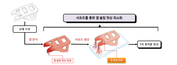 ▲ KETI가 개발한 SW를 바탕으로 서포트 최적화가 이뤄지면 금속 출력물의 열쏠림 현상이 완화될 수 있다.국내 연구진이 금속 3D프린팅 공정에서 발생하는 열 축적과 변형 현상을 사전 분석 후 서포트를 배치해 부품 품질을 향상시키는 소프트웨어(SW)를 개발했다.