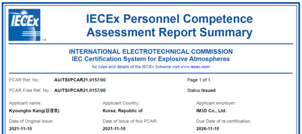 아이엠쓰리디(IM3D) 강경호 대표는 최근 국제 방폭 개인자격인증(IECEx CoPC)을 취득했다고 밝혔다. IECEx CoPC는 방폭관련 산업 종사자 개인을 대상으로 폭발위험지역에서의 방폭기기의 설계, 설치, 유지보수, 검사 등에 대한 평가를 통해 자격을 인증하는 제도로서 국제적으로 인정되는 방폭전문 개인자격증이다.