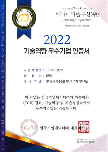 환자 맞춤형 수술 솔루션 전문기업 애니메디솔루션(대표 김국배)이 한국기업데이터(KED)의 기술신용평가에서 ‘기술 역량 우수기업’으로 선정되었다고 13일 밝혔다.