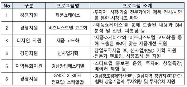 이밖에 지역의 창업지원 기관과 협력해 △경남창업페스티벌 △ GNCC X KICET 점프업! 스케일업! 프로그램을 통해 창업기업 육성 및 투자 활성화를 지원한다.