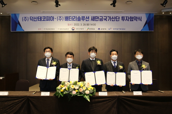 새만금개발청(청장 양충모)은 전북도, 군산시, 한국농어촌공사와 새만금산단에 이차전지 소재 제조사 ㈜덕산테코피아의 전해질, ㈜배터리솔루션의 양극재 제조시설 건립을 위한 투자협약을 체결했다고 28일 밝혔다.