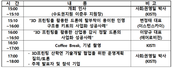KISTI 수도권지원 이준우 지원장의 개회사를 시작으로 △3D프린팅을 활용한 드론에 탈부착이 용이한 인명 구조용 키트의 사업화 성공사례(변정태 이스턴스카이 대표) △3D프린팅을 활용한 산업용 감시 정찰 드론의 사업화 성공사례(이양규 에어로비전 대표) 등이 발표된다.