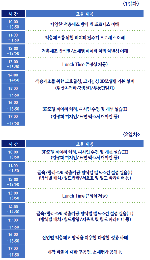1일자인 4월28일에는 △다양한 적층제조방식 및 프로세스이해 △적층제조를 위한 데이터 전주기 프로세스 이해 △적층제조 방식별/소재별 데이터 처리 차별성 이해 △적층제조를 위한 고효율성, 고기능성 3D모델링 기본 설계(위상최적화/경량화/부품단일화) △3D모델 데이터 처리, 디자인 수정 및 개선 실습(I)(경량화디자인/표면텍스쳐디자인 등) 등이 진행된다.