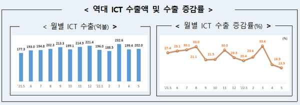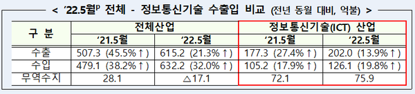 ▲ 22년 5월 전체 정보통신기술 수출입비교우리니라 5월 정보통신기술(ICT) 수출이 반도체, OLED 등 수요 증대로 역대 5월 수출액 중 최고를 기록했다.