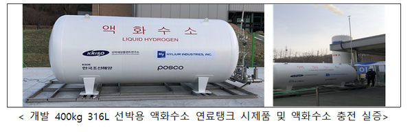 ▲ 400kg 316L 선박용 액화수소 연료탱크 시제품 및 액화수소 충전실증정부가 기존 수소저장방식 대비 극저온 환경에서도 많은 양을 저장할 수 있는 액화수소 연료탱크 기술을 해양수산 신기술로 인증했다.