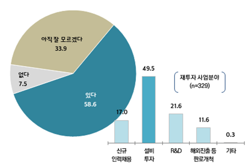 응답자58.6%가 조세 부담 완화분으로 사업에 재투자하겠다고 답했으며 기업 특성별로는 종사자 규모가 클수록, 1세대보다는 2세대가 재투자 의향이 높은 것으로 조사됐다. 재투자 의향이 있는 분야로는 ‘설비투자’가 49.5%로 가장 높았고, ‘R&D’(21.6%), ‘신규 인력 채용’(17.0%)의 순으로 답변했다.