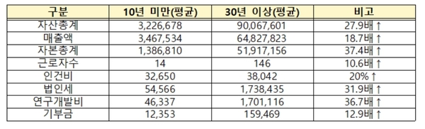 결과에 따르면, 기업의 업력이 높아질수록 자산, 매출, 고용, 연구개발비 등 전 분야에 걸쳐 경영성과는 높아지는 것으로 분석됐으나 업력이 높아질수록 대표자의 고령화도 상당히 진행된 것으로 나타났다.