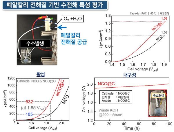 연구팀은 본 기술을 폐알칼리 전해질 기반 수전해 단위셀에 적용해 1,420mA/㎠(비귀금속 적용, 2V 기준)의 높은 전류밀도를 달성했고, 수소를 원활하게 생산할 수 있는 전류밀도에서도 향상된 내구성을 보이는 걸 확인했다. 이 결과, 폐알칼리 속에 존재하는 금속 이온의 분석을 통해 증가한 전해질 이온전도도가 수전해 성능을 향상시켰음을 밝혀냈다.